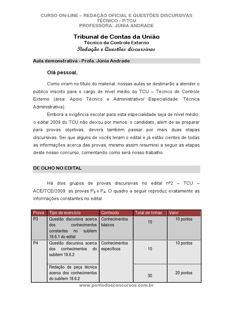 Por isso, os temas de redao abordaro questes antigas do Cespe e questes de conhecimentos atualizados diversos. Vamos trabalhar nesta fase com redaes de 30 linhas no mximo. - ETAPA 02 - sntese do texto: esta segunda fase aproveita os conhecimentos que o aluno adquiriu na fase anterior para ajud-lo a sintetizar o texto sem macular seu contedo. o momento em que redigiremos textos com no mximo 10 linhas e isso, que parece ser um trabalho fcil, na verdade consiste numa elaborao textual mais aprimorada, pois preciso aprender tcnicas de resumo para se redigir um texto com bastante objetividade e preciso. Quando chegarmos a essa etapa, ser importante que o aluno disponha de conhecimento bem sedimentado acerca dos contedos do edital, visto que os temas oferecidos constaro de questes tcnicas a fim de simularmos a prova P3 e P4. - ETAPA 03 - conceitos de redao oficial e confeco de expedientes: com os conhecimentos obtidos na fase 01 e reafirmados na fase 02, iremos estudar conceitos importantes de redao oficial e simular a confeco de textos como ofcio, parecer, comunicao interna etc. Portanto, o curso que oferecemos visa exatamente preparar o candidato tanto para a avaliao tcnica dos contedos do seu texto quanto expresso textual de acordo com a modalidade padro do portugus escrito. Por isso, mais uma vez digo que o candidato dever escrever todas as propostas de redao que lhe forem oferecidas nas diferentes etapas do curso, como tambm dever estudar os tpicos propostos para a prova objetiva com rigor, visto que o edital do TCU exige essa transversalidade de conhecimentos de uma prova para outra. Por fim, antes de iniciarmos nossa aula demonstrativa, solicito a todos que leiam a programao do curso bem como a programao de envio e correo de textos.