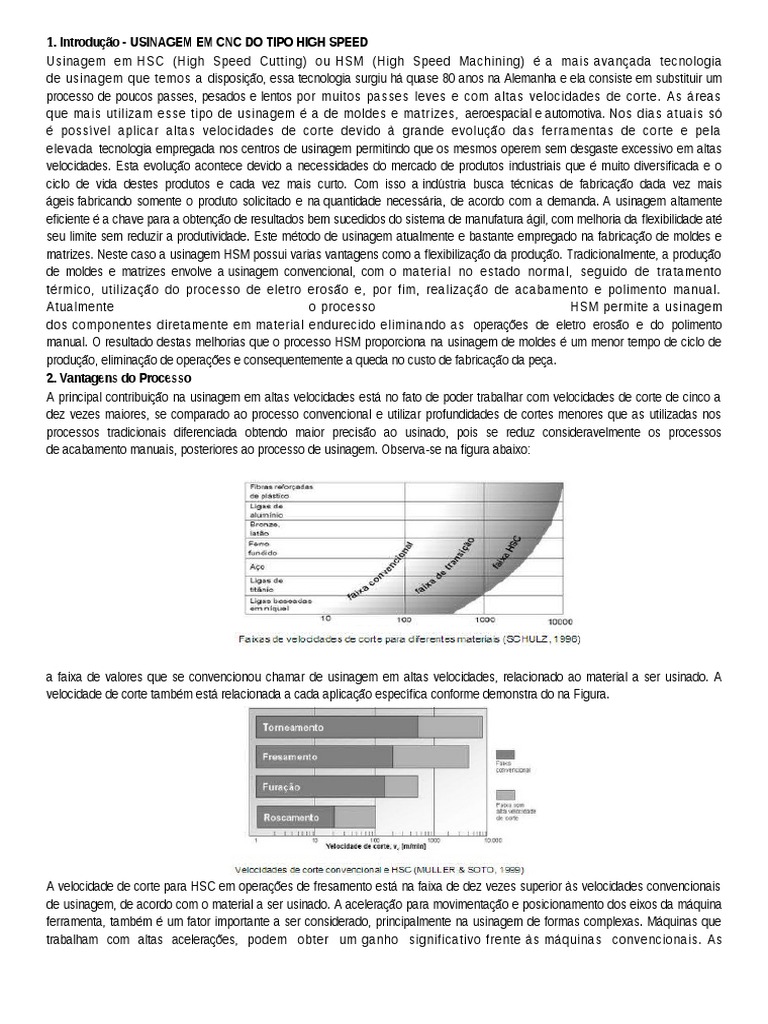Introduo - USINAGEM EM CNC DO TIPO HIGH SPEED Usinagem em HSC (High Speed Cutting) ou HSM (High Speed Machining) a mais avanada tecnologia de usinagem que temos a disposio, essa tecnologia surgiu h quase 80 anos na Alemanha e ela consiste em substituir um processo de poucos passes, pesados e lentos por muitos passes leves e com altas velocidades de corte. As reas que mais utilizam esse tipo de usinagem a de moldes e matrizes, aeroespacial e automotiva. Nos dias atuais s possvel aplicar altas velocidades de corte devido grande evoluo das ferramentas de corte e pela elevada tecnologia empregada nos centros de usinagem permitindo que os mesmos operem sem desgaste excessivo em altas velocidades. Esta evoluo acontece devido a necessidades do mercado de produtos industriais que muito diversificada e o ciclo de vida destes produtos e cada vez mais curto. Com isso a indstria busca tcnicas de fabricao dada vez mais geis fabricando somente o produto solicitado e na quantidade necessria, de acordo com a demanda. A usinagem altamente eficiente a chave para a obteno de resultados bem sucedidos do sistema de manufatura gil, com melhoria da flexibilidade at seu limite sem reduzir a produtividade. Este mtodo de usinagem atualmente e bastante empregado na fabricao de moldes e matrizes. Neste caso a usinagem HSM possui varias vantagens como a flexibilizao da produo. Tradicionalmente, a produo de moldes e matrizes envolve a usinagem convencional, com o material no estado normal, seguido de tratamento trmico, utilizao do processo de eletro eroso e, por fim, realizao de acabamento e polimento manual. Atualmente o processo HSM permite a usinagem dos componentes diretamente em material endurecido eliminando as operaes de eletro eroso e do polimento manual. O resultado destas melhorias que o processo HSM proporciona na usinagem de moldes um menor tempo de ciclo de produo, eliminao de operaes e consequentemente a queda no custo de fabricao da pea. 2. Vantagens do Processo A principal contribuio na usinagem em altas velocidades est no fato de poder trabalhar com velocidades de corte de cinco a dez vezes maiores, se comparado ao processo convencional e utilizar profundidades de cortes menores que as utilizadas nos processos tradicionais diferenciada obtendo maior preciso ao usinado, pois se reduz consideravelmente os processos de acabamento manuais, posteriores ao processo de usinagem. Observa-se na figura abaixo: