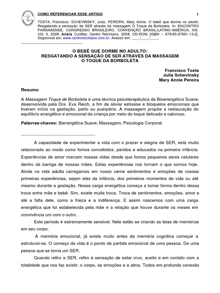 TOSTA, Francisco; SCHEVINSKY, Julia; PEREIRA, Mary Annie. O beb que dorme no adulto Resgatando a sensao de SER atravs da massagem O Toque da Borboleta. In: ENCONTRO PARANAENSE, CONGRESSO BRASILEIRO, CONVENO BRASIL/LATINO-AMRICA, XIII, VIII, II, 2008. Anais. Curitiba: Centro Reichiano, 2008. CD-ROM. [ISBN 978-85-87691-13-2]. Disponvel em: www.centroreichiano.com.br. Acesso em: ____/____/____. ______________________________