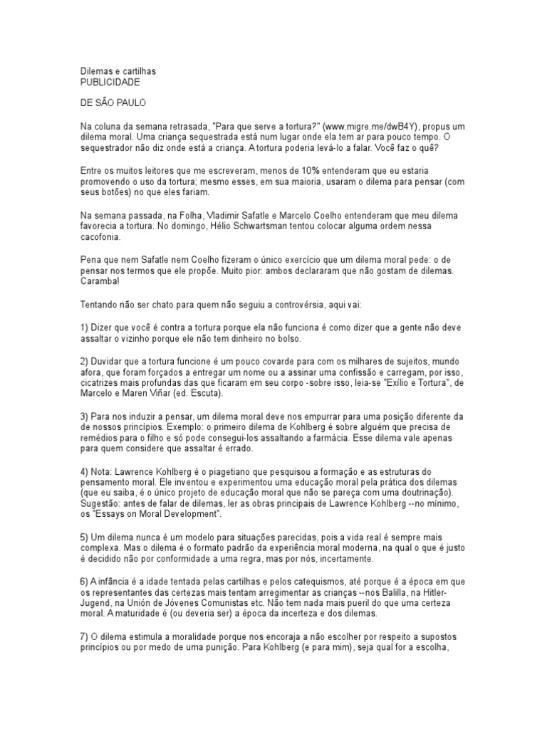 Uma criana sequestrada est num lugar onde ela tem ar para pouco tempo. O sequestrador no diz onde est a criana. A tortura poderia lev-lo a falar. Voc faz o qu? Entre os muitos leitores que me escreveram, menos de 10% entenderam que eu estaria promovendo o uso da tortura; mesmo esses, em sua maioria, usaram o dilema para pensar (com seus botes) no que eles fariam. Na semana passada, na Folha, Vladimir Safatle e Marcelo Coelho entenderam que meu dilema favorecia a tortura. No domingo, Hlio Schwartsman tentou colocar alguma ordem nessa cacofonia. Pena que nem Safatle nem Coelho fizeram o nico exerccio que um dilema moral pede: o de pensar nos termos que ele prope. Muito pior: ambos declararam que no gostam de dilemas. Caramba! Tentando no ser chato para quem no seguiu a controvrsia, aqui vai: 1) Dizer que voc contra a tortura porque ela no funciona como dizer que a gente no deve assaltar o vizinho porque ele no tem dinheiro no bolso. 2) Duvidar que a tortura funcione um pouco covarde para com os milhares de sujeitos, mundo afora, que foram forados a entregar um nome ou a assinar uma confisso e carregam, por isso, cicatrizes mais profundas das que ficaram em seu corpo -sobre isso, leia-se "Exlio e Tortura", de Marcelo e Maren Viar (ed. Escuta). 3) Para nos induzir a pensar, um dilema moral deve nos empurrar para uma posio diferente da de nossos princpios. Exemplo: o primeiro dilema de Kohlberg sobre algum que precisa de remdios para o filho e s pode consegui-los assaltando a farmcia. Esse dilema vale apenas para quem considere que assaltar errado. 4) Nota: Lawrence Kohlberg o piagetiano que pesquisou a formao e as estruturas do pensamento moral. Ele inventou e experimentou uma educao moral pela prtica dos dilemas (que eu saiba, o nico projeto de educao moral que no se parea com uma doutrinao). Sugesto: antes de falar de dilemas, ler as obras principais de Lawrence Kohlberg --no mnimo, os "Essays on Moral Development". 5) Um dilema nunca um modelo para situaes parecidas, pois a vida real sempre mais complexa. Mas o dilema o formato padro da experincia moral moderna, na qual o que justo decidido no por conformidade a uma regra, mas por ns, incertamente. 6) A infncia a idade tentada pelas cartilhas e pelos catequismos, at porque a poca em que os representantes das certezas mais tentam arregimentar as crianas --nos Balilla, na HitlerJugend, na Unin de Jvenes Comunistas etc. No tem nada mais pueril do que uma certeza moral. A maturidade (ou deveria ser) a poca da incerteza e dos dilemas. 7) O dilema estimula a moralidade porque nos encoraja a no escolher por respeito a supostos princpios ou por medo de uma punio. Para Kohlberg (e para mim), seja qual for a escolha,
