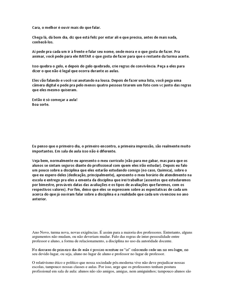 Eu penso que o primeiro dia, o primeiro encontro, a primeira impresso, so realmente muito importantes. Em sala de aula isso no diferente. Veja bem, normalmente eu apresento o meu curriculo (no para me gabar, mas para que os alunos se sintam seguros diante do profissional com quem eles iro estudar). Depois eu falo um pouco sobre a disciplina que eles estaro estudando comigo (no caso, Qumica), sobre o que eu espero deles (dedicao, principalmente), apresento o meu horrio de atendimento na escola e entrego pra eles a ementa da disciplina que irei trabalhar (assuntos que estudaremos por bimestre, provveis datas das avaliaes e os tipos de avaliaes que faremos, com os respectivos valores). Por fim, deixo que eles se expressem sobre as expectativas de cada um acerca do que j ouviram falar sobre a disciplina e a realidade que cada um vivenciou no ano anterior.