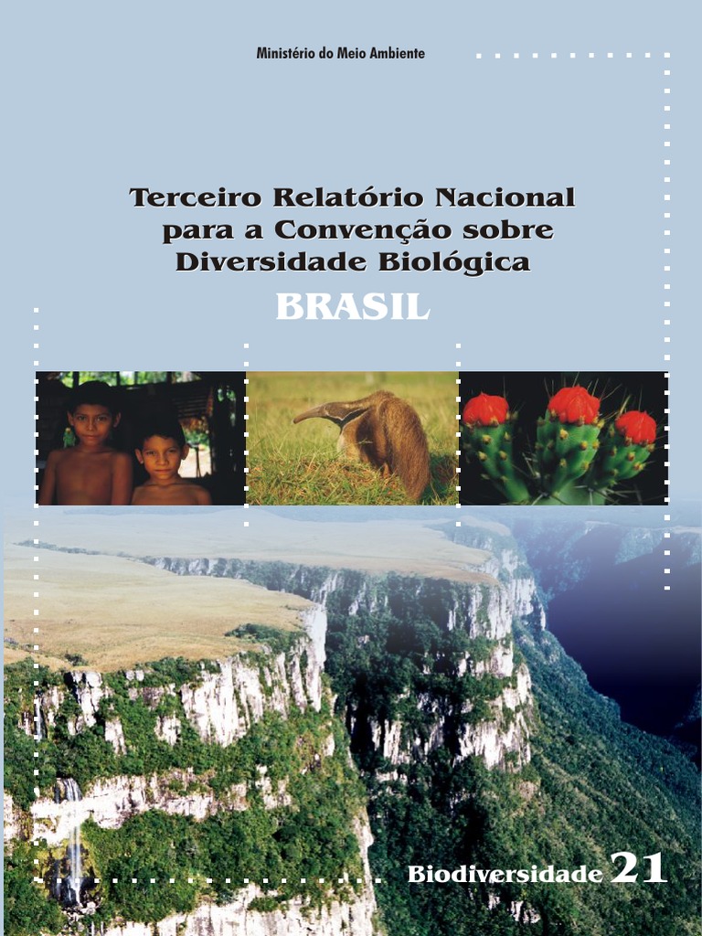TERCEIRO RELATRIO NACIONAL DO BRASIL PARA A CONVENO SOBRE DIVERSIDADE BIOLGICA: BRASIL Coordenao Braulio Ferreira de Souza Dias Equipe do Projeto Estratgia Nacional da Diversidade Biolgica e Relatrio Nacional Nbia Cristina Bezerra da Silva (coordenadora), Andreina D'ayala Valva, Helio Jorge da Cunha, Luciana Aparecida Zago de Andrade, Marilia Guimares Arajo de Oliveira e Pedro Davison Consolidao das informaes Gabriela Tunes da Silva, Andreina D'ayala Valva, Helio Jorge da Cunha, Luciana Aparecida Zago de Andrade e Pedro Davison Reviso Tcnica Andreina D'ayala Valva, Helio Jorge da Cunha e Luciana Aparecida Zago de Andrade Reviso do texto em portugs Maria Beatriz Maury de Carvalho Capa e Projeto Grfico Ana Lcia Leite Prates Editorao Alenne Felizardo Namba e Ana Lcia Leite Prates Fotos gentilmente cedidas Jos Sabino, Paulo Uras e Rafael Oliveira Fotos capa Jos Sabino (Tamandu) e Rafael Oliveira (Aparados da Serra, Cactus, Crianas) Apoio Projeto Estratgia Nacional da Diversidade Biolgica e Relatrio Nacional - BRA 97/G31; Fundo Mundial para o Meio Ambiente - GEF; Agncia Brasileira de Cooperao - ABC; Programa das Naes Unidas para o Desenvolvimento - PNUD e Programa Nacional de Diversidade Biolgica - PRONABIO ________________________________________________________________________________