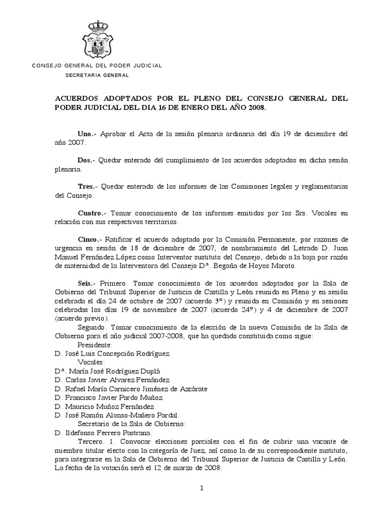 ACUERDOS ADOPTADOS POR EL PLENO DEL CONSEJO GENERAL DEL PODER JUDICIAL DEL DIA 16 DE ENERO DEL AO 2008. Uno.- Aprobar el Acta de la sesin plenaria ordinaria del da 19 de diciembre del ao 2007. Dos.- Quedar enterado del cumplimiento de los acuerdos adoptados en dicha sesin plenaria. Tres.- Quedar enterado de los informes de las Comisiones legales y reglamentarias del Consejo. Cuatro.- Tomar conocimiento de los informes emitidos por los Srs. Vocales en relacin con sus respectivos territorios. Cinco.- Ratificar el acuerdo adoptado por la Comisin Permanente, por razones de urgencia en sesin de 18 de diciembre de 2007, de nombramiento del Letrado D. Juan Manuel Fernndez Lpez como Interventor sustituto del Consejo, debido a la baja por razn de maternidad de la Interventora del Consejo D. Begoa de Hoyos Maroto. Seis.- Primero. Tomar conocimiento de los acuerdos adoptados por la Sala de Gobierno del Tribunal Superior de Justicia de Castilla y Len reunida en Pleno y en sesin celebrada el da 24 de octubre de 2007 (acuerdo 3) y reunida en Comisin y en sesiones celebradas los das 19 de noviembre de 2007 (acuerdo 24) y 4 de diciembre de 2007 (acuerdo previo). Segundo. Tomar conocimiento de la eleccin de la nueva Comisin de la Sala de Gobierno para el ao judicial 2007-2008, que ha quedado constituida como sigue: Presidente: D. Jos Luis Concepcin Rodrguez. Vocales: D. Mara Jos Rodrguez Dupl D. Carlos Javier Alvarez Fernndez D. Rafael Mara Carnicero Jimnez de Azcrate D. Francisco Javier Pardo Muoz D. Mauricio Muoz Fernndez D. Jos Ramn Alonso-Maero Pardal. Secretario de la Sala de Gobierno: D. Ildefonso Ferrero Pastrana. Tercero. 1. Convocar elecciones parciales con el fin de cubrir una vacante de miembro titular electo con la categora de Juez, as como la de su correspondiente sustituto, para integrarse en la Sala de Gobierno del Tribunal Superior de Justicia de Castilla y Len. La fecha de la votacin ser el 12 de marzo de 2008.