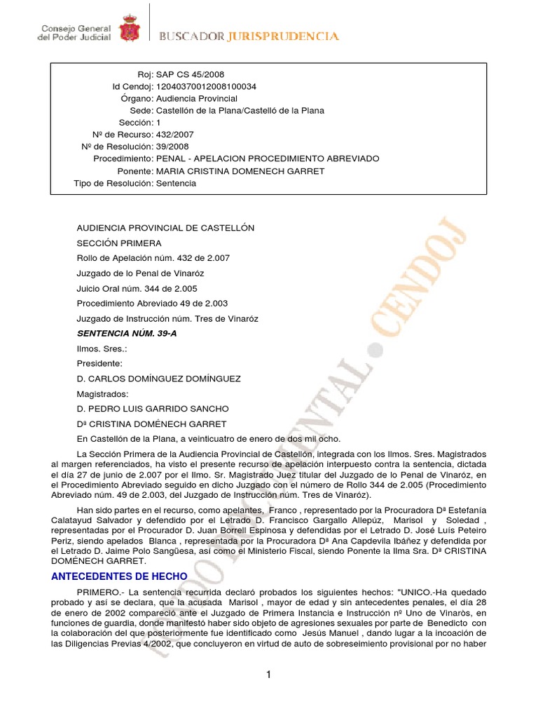 AUDIENCIA PROVINCIAL DE CASTELLN SECCIN PRIMERA Rollo de Apelacin nm. 432 de 2.007 Juzgado de lo Penal de Vinarz Juicio Oral nm. 344 de 2.005 Procedimiento Abreviado 49 de 2.003 Juzgado de Instruccin nm. Tres de Vinarz SENTENCIA NM. 39-A Ilmos. Sres.: Presidente: D. CARLOS DOMNGUEZ DOMNGUEZ Magistrados: D. PEDRO LUIS GARRIDO SANCHO D CRISTINA DOMNECH GARRET En Castelln de la Plana, a veinticuatro de enero de dos mil ocho. La Seccin Primera de la Audiencia Provincial de Castelln, integrada con los Ilmos. Sres. Magistrados al margen referenciados, ha visto el presente recurso de apelacin interpuesto contra la sentencia, dictada el da 27 de junio de 2.007 por el Ilmo. Sr. Magistrado Juez titular del Juzgado de lo Penal de Vinarz, en el Procedimiento Abreviado seguido en dicho Juzgado con el nmero de Rollo 344 de 2.005 (Procedimiento Abreviado nm. 49 de 2.003, del Juzgado de Instruccin nm. Tres de Vinarz). Han sido partes en el recurso, como apelantes, Franco , representado por la Procuradora D Estefana Calatayud Salvador y defendido por el Letrado D. Francisco Gargallo Allepz, Marisol y Soledad , representadas por el Procurador D. Juan Borrell Espinosa y defendidas por el Letrado D. Jos Lus Peteiro Periz, siendo apelados Blanca , representada por la Procuradora D Ana Capdevila Ibez y defendida por el Letrado D. Jaime Polo Sangesa, as como el Ministerio Fiscal, siendo Ponente la Ilma Sra. D CRISTINA DOMNECH GARRET.
