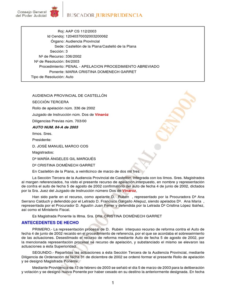 AUDIENCIA PROVINCIAL DE CASTELLN SECCIN TERCERA Rollo de apelacin nm. 336 de 2002 Juzgado de Instruccin nm. Dos de Vinarz Diligencias Previas nm. 703/00 AUTO NUM. 84-A de 2003 Ilmos. Sres. Presidente: D. JOS MANUEL MARCO COS Magistrados: D MARA NGELES GIL MARQUS D CRISTINA DOMNECH GARRET En Castelln de la Plana, a veinticinco de marzo de dos mil tres. La Seccin Tercera de la Audiencia Provincial de Castelln, integrada con los Ilmos. Sres. Magistrados al margen referenciados, ha visto el presente recurso de apelacin interpuesto, en nombre y representacin de contra el auto de fecha 5 de agosto de 2002 confirmatorio del auto de fecha 4 de junio de 2002, dictados por la Sra. Juez del Juzgado de Instruccin nmero Dos de Vinarz, Han sido parte en el recurso, como apelante D. Rubn , representado por la Procuradora D Ana Serrano Calduch y defendido por el Letrado D. Francisco Gargallo Allepuz, siendo apelados D. Ana Mara , representada por el Procurador D. Agustn Juan Ferrer y defendida por la Letrada D Cristina Lpez Ibez, as como el Ministerio Fiscal. Es Magistrada Ponente la Iltma. Sra. Da. CRISTINA DOMNECH GARRET