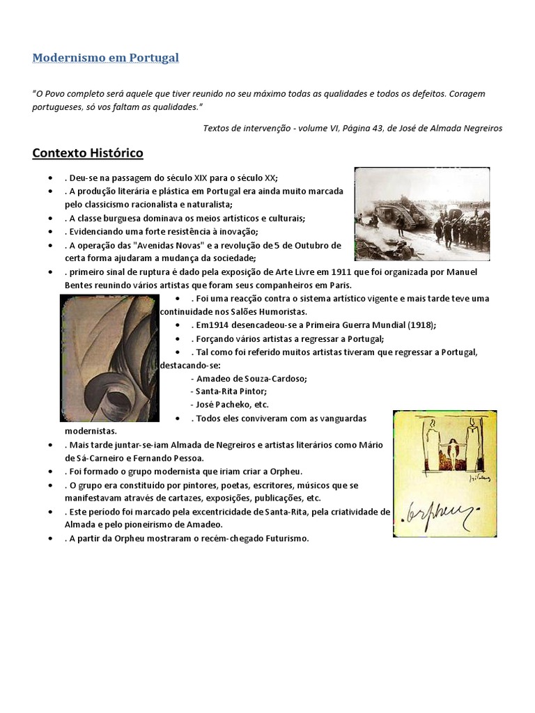 . Deu-se na passagem do sculo XIX para o sculo XX; . A produo literria e plstica em Portugal era ainda muito marcada pelo classicismo racionalista e naturalista; . A classe burguesa dominava os meios artsticos e culturais; . Evidenciando uma forte resistncia inovao; . A operao das "Avenidas Novas" e a revoluo de 5 de Outubro de certa forma ajudaram a mudana da sociedade; . primeiro sinal de ruptura dado pela exposio de Arte Livre em 1911 que foi organizada por Manuel Bentes reunindo vrios artistas que foram seus companheiros em Paris. . Foi uma reaco contra o sistema artstico vigente e mais tarde teve uma continuidade nos Sales Humoristas. . Em1914 desencadeou-se a Primeira Guerra Mundial (1918); . Forando vrios artistas a regressar a Portugal; . Tal como foi referido muitos artistas tiveram que regressar a Portugal, destacando-se: - Amadeo de Souza-Cardoso; - Santa-Rita Pintor; - Jos Pacheko, etc. . Todos eles conviveram com as vanguardas modernistas. . Mais tarde juntar-se-iam Almada de Negreiros e artistas literrios como Mrio de S-Carneiro e Fernando Pessoa. . Foi formado o grupo modernista que iriam criar a Orpheu. . O grupo era constitudo por pintores, poetas, escritores, msicos que se manifestavam atravs de cartazes, exposies, publicaes, etc. . Este perodo foi marcado pela excentricidade de Santa-Rita, pela criatividade de Almada e pelo pioneirismo de Amadeo. . A partir da Orpheu mostraram o recm-chegado Futurismo.