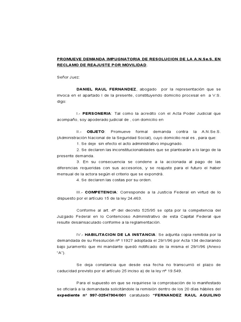 (Administracin Nacional de la Seguridad Social), cuyo domicilio real es , para que: 1. Se deje sin efecto el acto administrativo impugnado. 2. Se declaren las inconstitucionalidades que se plantearn a lo largo de la presente demanda. 3. En su consecuencia se condene a la accionada al pago de las diferencias requeridas con sus accesorios, y se reajuste para el futuro el haber mensual de la actora segn el criterio que se expondr. 4. Se declaren las costas por su orden. III.- COMPETENCIA: Corresponde a la Justicia Federal en virtud de lo dispuesto por el artculo 15 de la ley 24.463. Conforme al art. 4 del decreto 525/95 se opta por la competencia del Juzgado Federal en lo Contencioso Administrativo de esta Capital Federal que resulte desainsaculado conforme a la reglamentacin. IV.- HABILITACION DE LA INSTANCIA: Se adjunta copia remitida por la demandada de su Resolucin n 11927 adoptada el 29/1/96 por Acta 134 declarando bajo juramento que mi mandante qued notificado de la misma el 29/1/96 (Anexo A). Se deja constancia que desde esa fecha no transcurri el plazo de caducidad previsto por el artculo 25 inciso a) de la ley n 19.549. Para el supuesto en que se requiriese la comprobacin de lo manifestado se oficiar a la demandada solicitndole la remisin dentro de los 20 das hbiles del expediente n 997-32547904/001 caratulado FERNANDEZ RAUL AQUILINO