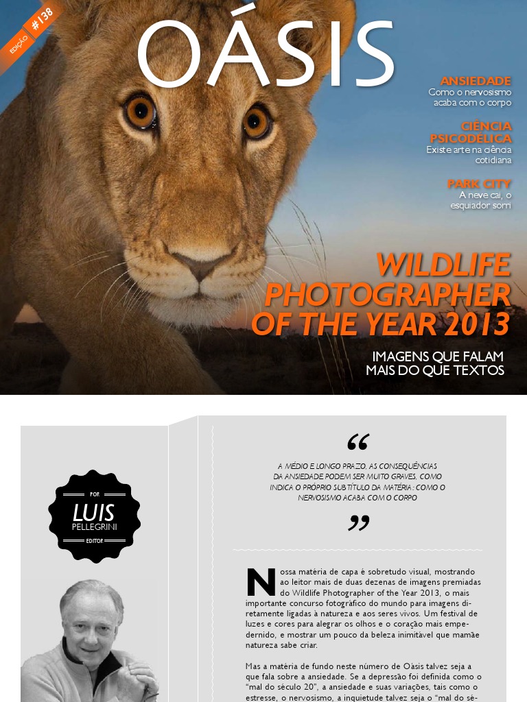 ossa matria de capa sobretudo visual, mostrando ao leitor mais de duas dezenas de imagens premiadas do Wildlife Photographer of the Year 2013, o mais importante concurso fotogrfico do mundo para imagens diretamente ligadas natureza e aos seres vivos. Um festival de luzes e cores para alegrar os olhos e o corao mais empedernido, e mostrar um pouco da beleza inimitvel que mame natureza sabe criar. Mas a matria de fundo neste nmero de Osis talvez seja a que fala sobre a ansiedade. Se a depresso foi definida como o mal do sculo 20, a ansiedade e suas variaes, tais como o estresse, o nervosismo, a inquietude talvez seja o mal do sculo 21, a tal ponto ela hoje est generalizada, sobretudo nos grandes centros urbanos. A mdio e longo prazo, as consequncias da ansiedade podem