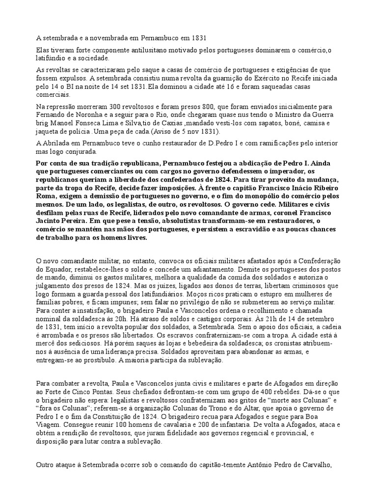 e a sociedade. As revoltas se caracterizaram pelo saque a casas de comrcio de portugueses e e ig!ncias de que fossem e pulsos. A setembrada consistiu numa revolta da guarni"#o do E rcito no $ecife iniciada pelo 1% o &' na noite de 1% set 1831.Ela dominou a cidade at 1( e foram saqueadas casas comerciais. )a repress#o morreram 3** revoltosos e foram presos 8**, que foram enviados inicialmente para +ernando de )oron,a e a seguir para o $io, onde c,egaram quase nus tendo o -inistro da .uerra brig -anoel +onseca /ima e 0ilva,tio de 1a ias ,mandado vesti2los com sapatos, bon, camisa e 3aqueta de pol4cia .5ma pe"a de cada.6Aviso de 7 nov 18318. A Abrilada em Pernambuco teve o cun,o restaurador de 9.Pedro ' e com ramifica":es pelo interior mas logo con3urada. Por conta de sua tradio republicana, Pernambuco festejou a abdicao de Pedro I. Ainda que portugueses comerciantes ou com cargos no governo defendessem o imperador, os republicanos queriam a liberdade dos confederados de 182 . Para tirar proveito da mudana, parte da tropa do !ecife, decide fa"er imposi#es. $ frente o capito %rancisco In&cio !ibeiro !oma, e'igem a demisso de portugueses no governo, e o fim do monop(lio do com)rcio pelos mesmos. *e um lado, os legalistas, de outro, os revoltosos. + governo cede. ,ilitares e civis desfilam pelas ruas de !ecife, liderados pelo novo comandante de armas, coronel %rancisco -acinto Pereira. .m que pese a tenso, absolutistas transformam/se em restauradores, o com)rcio se mant)m nas mos dos portugueses, e persistem a escravido e as poucas c0ances de trabal0o para os 0omens livres. ; novo comandante militar, no entanto, convoca os oficiais militares afastados ap<s a 1onfedera"#o do Equador, restabelece2l,es o soldo e concede um adiantamento. 9emite os portugueses dos postos de mando, diminui os gastos militares, mel,ora a qualidade da comida dos soldados e autoriza o 3ulgamento dos presos de 18=%. -as os 3u4zes, ligados aos donos de terras, libertam criminosos que logo formam a guarda pessoal dos latifundi>rios. -o"os ricos praticam o estupro em mul,eres de fam4lias pobres, e ficam impunes? sem falar no privilgio de n#o se submeterem ao servi"o militar. Para conter a insatisfa"#o, o brigadeiro Paula e @asconcelos ordena o recol,imento e c,amada nominal da soldadesca As =*,. B> atraso de soldos e castigos corporais. Cs =1, de 1% de setembro de 1831, tem in4cio a revolta popular dos soldados, a 0etembrada. 0em o apoio dos oficiais, a cadeia arrombada e os presos s#o libertados. ;s escravos confraternizam2se com a tropa. A cidade est> A merc! dos sediciosos. B> porm saques As lo3as e bebedeira da soldadesca? os cronistas atribuem2 nos A aus!ncia de uma lideran"a precisa. 0oldados aproveitam para abandonar as armas, e entregam2se ao prost4bulo. A maioria participa da subleva"#o. Para combater a revolta, Paula e @asconcelos 3unta civis e militares e parte de Afogados em dire"#o ao +orte de 1inco Pontas. 0eus c,efiados defrontam2se com um grupo de %** rebeldes. 9>2se o que o brigadeiro n#o esperaD legalistas e revoltosos confraternizam aos gritos de Emorte aos 1olunasF e Efora os 1olunasF? referem2se A organiza"#o 1olunas do Grono e do Altar, que apoia o governo de Pedro ' e o fim da 1onstitui"#o de 18=%. ; brigadeiro recua para Afogados e segue para &oa @iagem. 1onsegue reunir 1** ,omens de cavalaria e =** de infantaria. 9e volta a Afogados, ataca e obtm a rendi"#o de revoltosos, que 3uram fidelidade aos governos regencial e provincial, e disposi"#o para lutar contra a subleva"#o. ;utro ataque A 0etembrada ocorre sob o comando do capit#o2tenente AntHnio Pedro de 1arval,o,