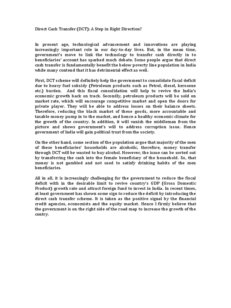 In present age, technological advancement and innovations are playing increasingly important role in our day-to-day lives. But, in the mean time, governments move to link the technology to transfer cash directly in to beneficiaries account has sparked much debate. Some people argue that direct cash transfer is fundamentally benefit the below poverty line population in India while many contend that it has detrimental effect as well. First, DCT scheme will definitely help the government to consolidate fiscal deficit due to heavy fuel subsidy (Petroleum products such as Petrol, diesel, kerosene etc.) burden. And this fiscal consolidation will help to revive the Indias economic growth back on track. Secondly, petroleum products will be sold on market rate, which will encourage competitive market and open the doors for private player. They will be able to address losses on their balance sheets. Therefore, reducing the black market of these goods, more accountable and taxable money pump in to the market, and hence a healthy economic climate for the growth of the country. In addition, it will vanish the middleman from the picture and shows governments will to address corruption issue. Hence government of India will gain political trust from the society. On the other hand, some section of the population argue that majority of the men of these beneficiaries households are alcoholic, therefore, money transfer through DCT will be wasted to buy alcohol. However, the issue can be sorted out by transferring the cash into the female beneficiary of the household. So, that money is not gambled and not used to satisfy drinking habits of the men beneficiaries. All in all, it is increasingly challenging for the government to reduce the fiscal deficit with in the desirable limit to revive countrys GDP (Gross Domestic Product) growth rate and attract foreign fund to invest in India. In recent times, at least government has shown some sign to reduce the deficit by introducing the direct cash transfer scheme. It is taken as the positive signal by the financial credit agencies, economists and the equity market. Hence I firmly believe that the government is on the right side of the road map to increase the growth of the contry.