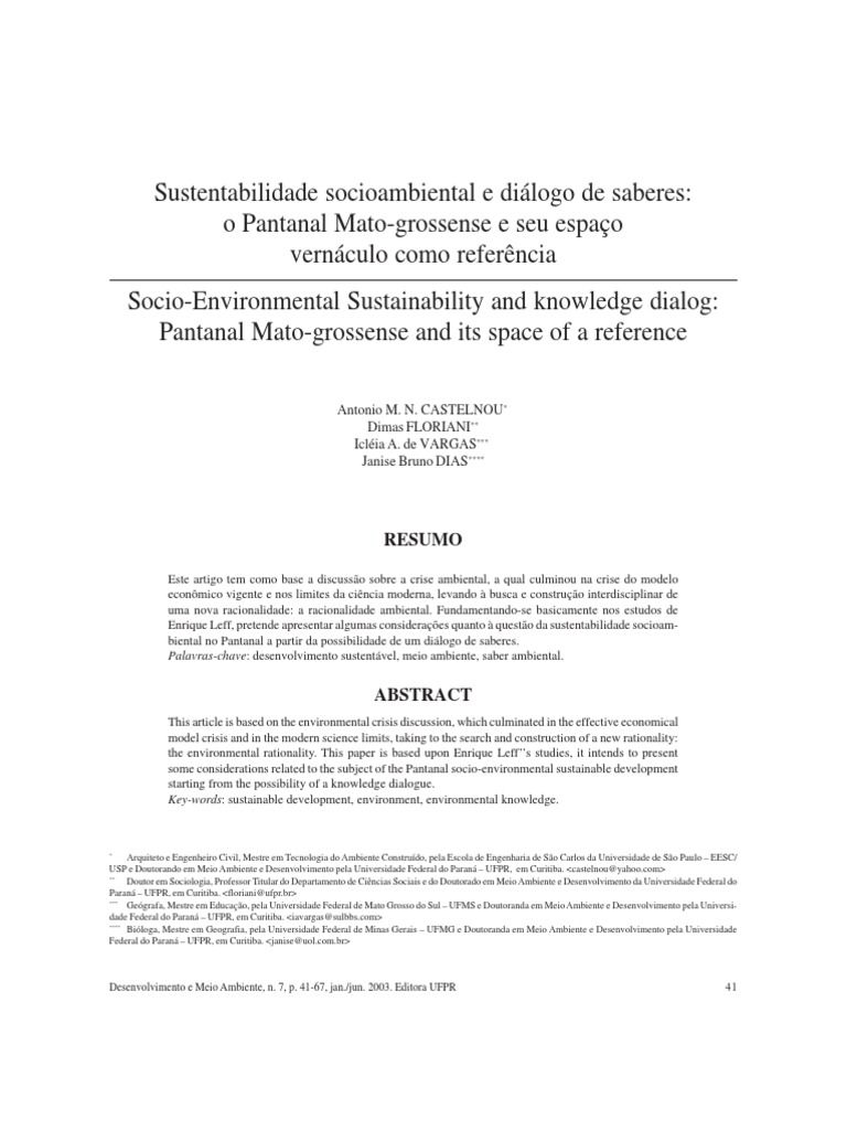 * Arquiteto e Engenheiro Civil, Mestre em Tecnologia do Ambiente Construdo, pela Escola de Engenharia de So Carlos da Universidade de So Paulo EESC/ USP e Doutorando em Meio Ambiente e Desenvolvimento pela Universidade Federal do Paran UFPR, em Curitiba. <castelnou@yahoo.com> ** Doutor em Sociologia, Professor Titular do Departamento de Cincias Sociais e do Doutorado em Meio Ambiente e Desenvolvimento da Universidade Federal do Paran UFPR, em Curitiba. <floriani@ufpr.br> *** Gegrafa, Mestre em Educao, pela Universidade Federal de Mato Grosso do Sul UFMS e Doutoranda em Meio Ambiente e Desenvolvimento pela Universidade Federal do Paran UFPR, em Curitiba. <iavargas@sulbbs.com> **** Biloga, Mestre em Geografia, pela Universidade Federal de Minas Gerais UFMG e Doutoranda em Meio Ambiente e Desenvolvimento pela Universidade Federal do Paran UFPR, em Curitiba. <janise@uol.com.br>