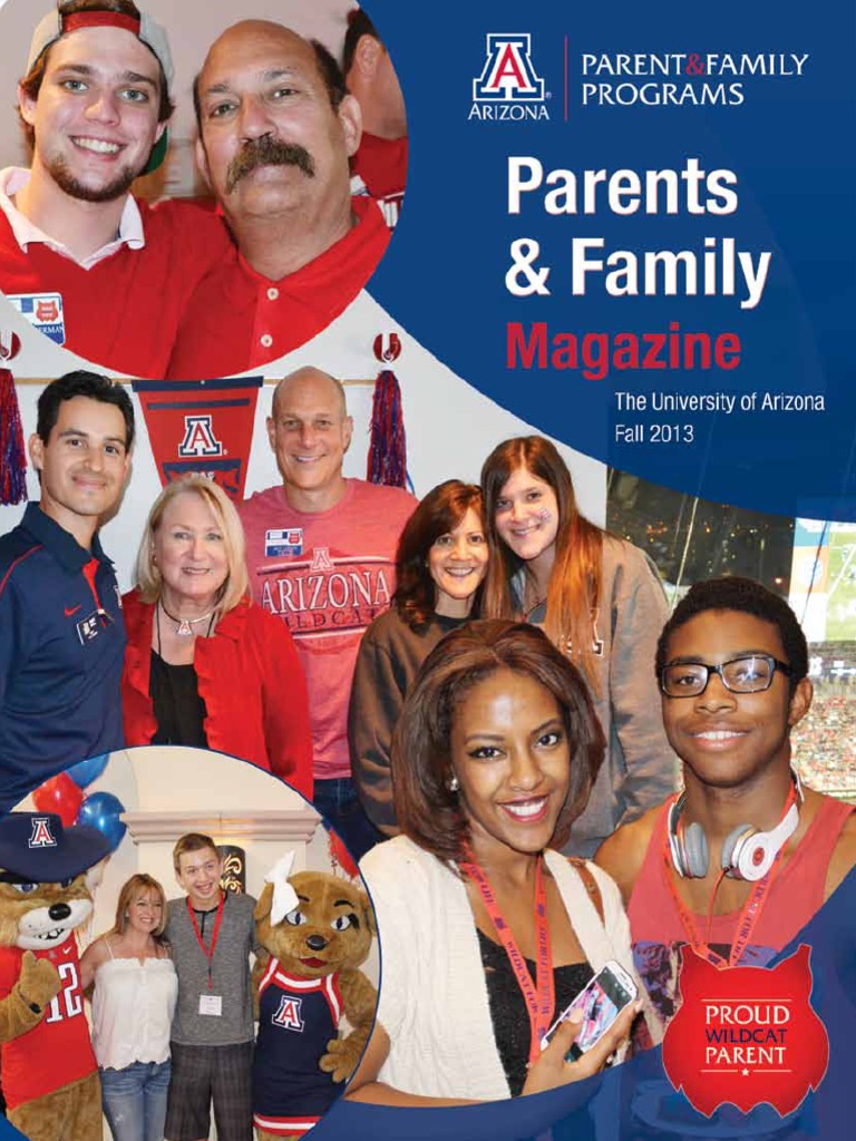 The University of Arizona Parents & Family Magazine is published twice a year by the Dean of Students Office and Arizona Student Media. The University of Arizona PO Box 210040 Tucson, AZ 85721 Editor Kathy Adams Riester Associate Dean of Students Director UA Parent & Family Programs kriester@email.arizona.edu 520-621-0884 Advertising Milani Hunt Marketing Coordinator Arizona Student Media milanih@email.arizona.edu 520-626-8546 Design & Production Cindy Callahan Creative Services Manager Arizona Student Media cynthiac@email.arizona.edu 520-621-3377 Circulation: 15,000