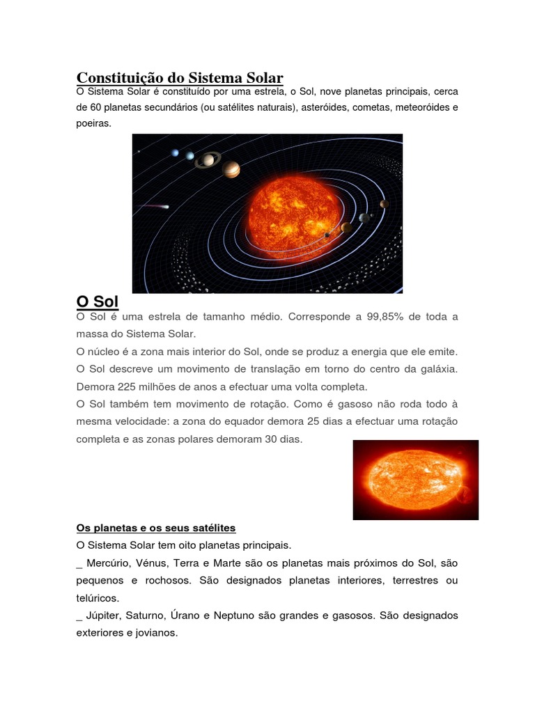 O Sistema Solar constitudo por uma estrela, o Sol, nove planetas principais, cerca de 60 planetas secundrios (ou satlites naturais), asterides, cometas, meteorides e poeiras.