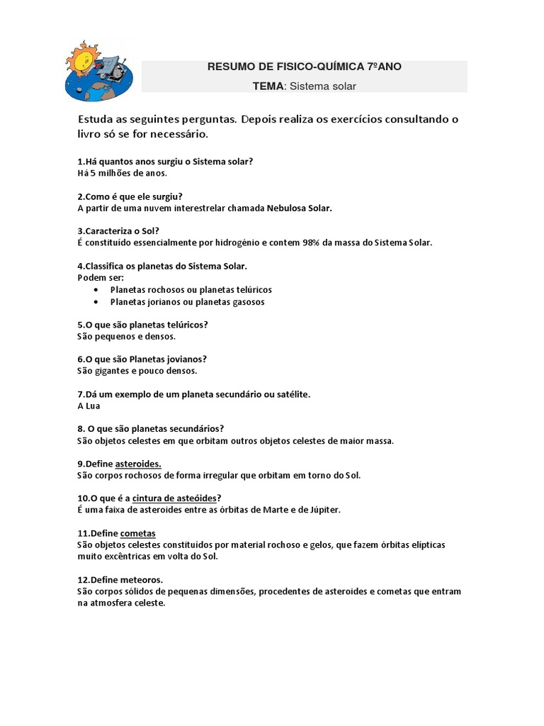 1.H quantos anos surgiu o Sistema solar? H 5 milhes de anos. 2.Como que ele surgiu? A partir de uma nuvem interestrelar chamada Nebulosa Solar. 3.Caracteriza o Sol? constitudo essencialmente por hidrognio e contem 98% da massa do Sistema Solar. 4.Classifica os planetas do Sistema Solar. Podem ser: Planetas rochosos ou planetas telricos Planetas jorianos ou planetas gasosos 5.O que so planetas telricos? So pequenos e densos. 6.O que so Planetas jovianos? So gigantes e pouco densos. 7.D um exemplo de um planeta secundrio ou satlite. A Lua 8. O que so planetas secundrios? So objetos celestes em que orbitam outros objetos celestes de maior massa. 9.Define asteroides. So corpos rochosos de forma irregular que orbitam em torno do Sol. 10.O que a cintura de asteides? uma faixa de asteroides entre as rbitas de Marte e de Jpiter. 11.Define cometas So objetos celestes constitudos por material rochoso e gelos, que fazem rbitas elpticas muito excntricas em volta do Sol. 12.Define meteoros. So corpos slidos de pequenas dimenses, procedentes de asteroides e cometas que entram na atmosfera celeste.
