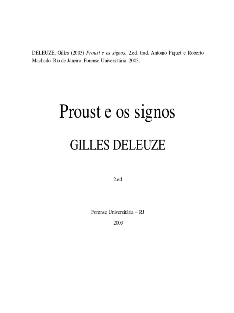 22 com a diferena de ser neste anterior e naquele posterior o tra balho da inteligncia."15 Em primeiro lugar, preciso sentir o efeito violento de um signo, e que o pensamento seja como que forado a procurar o sentido do signo. Em Proust, o pensamento geralmente aparece sob vrias formas: memria, desejo, imaginao, inteligncia, faculdade das essncias... Mas, no caso do tempo que se perde e do tempo perdido, a inteligncia, e apenas ela, que capaz de tornar possvel o esforo do pensamento, ou de interpretar o signo; ela que o encontra, contanto que venha "depois". Dentre todas as formas do pensamento, s a inteligncia extrai as verdades dessa ordem. Os signos mundanos so frvolos, os do amor e do cime, dolorosos; mas quem procuraria a verdade se no tivesse aprendido que um gesto, uma inflexo, uma saudao devem ser interpretados? Quem procuraria a verdade se no tivesse inicialmente experimentado o sofrimento que causa a mentira do ser amado? As idias da inteligncia so muitas vezes "sucedneos" do desgosto. 16 A dor fora a inteligncia a pesquisar, como certos prazeres inslitos pem a memria a funcionar. Cabe inteligncia compreender, e nos fazer compreender, que os signos mais frvolos da mundanidade correspondem a determinadas leis e que os signos dolorosos do amor correspondem a repeties. Assim, aprendemos a nos servir dos seres: frvolos ou cruis, eles "posaram diante de ns", eles nada mais so do que a encarnao de temas que os ultrapassam, ou pedaos de uma divindade que nada mais pode contra ns. A descoberta das leis mundanas d um sentido a signos que se tornariam in significantes tomados isoladamente; mas, sobretudo, a compreenso de nossas repeties amorosas transforma em alegria cada um desses signos que, tomados isoladamente, tanto sofri15.T R 130. 16.T R 150.