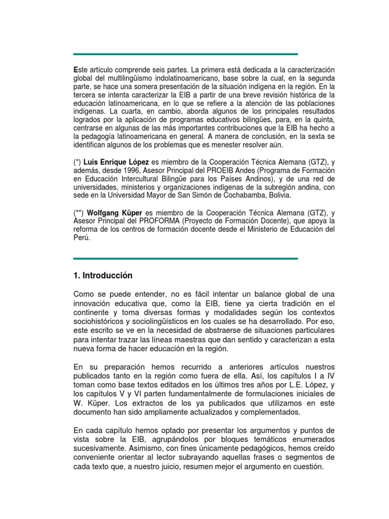 La primera est dedicada a la caracterizacin global del multilingismo indolatinoamericano, base sobre la cual, en la segunda parte, se hace una somera presentacin de la situacin indgena en la regin. En la tercera se intenta caracterizar la EIB a partir de una breve revisin histrica de la educacin latinoamericana, en lo que se refiere a la atencin de las poblaciones indgenas. La cuarta, en cambio, aborda algunos de los principales resultados logrados por la aplicacin de programas educativos bilinges, para, en la quinta, centrarse en algunas de las ms importantes contribuciones que la EIB ha hecho a la pedagoga latinoamericana en general. A manera de conclusin, en la sexta se identifican algunos de los problemas que es menester resolver an. (*) Luis Enrique Lpez es miembro de la Cooperacin Tcnica Alemana (GTZ), y adems, desde 1996, Asesor Principal del PROEIB Andes (Programa de Formacin en Educacin Intercultural Bilinge para los Pases Andinos), y de una red de universidades, ministerios y organizaciones indgenas de la subregin andina, con sede en la Universidad Mayor de San Simn de Cochabamba, Bolivia. (**) Wolfgang Kper es miembro de la Cooperacin Tcnica Alemana (GTZ), y Asesor Principal del PROFORMA (Proyecto de Formacin Docente), que apoya la reforma de los centros de formacin docente desde el Ministerio de Educacin del Per.