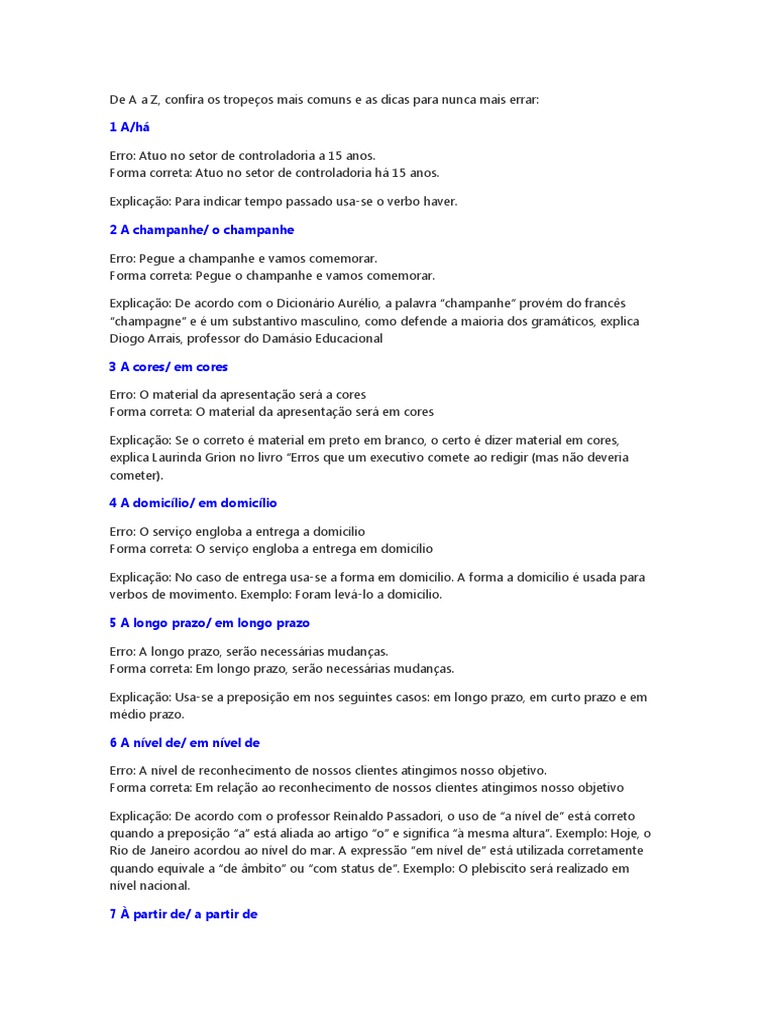 Forma correta: Atuo no setor de controladoria h 15 anos. Explicao: Para indicar tempo passado usa-se o verbo haver. 2 A champanhe/ o champanhe Erro: Pegue a champanhe e vamos comemorar. Forma correta: Pegue o champanhe e vamos comemorar. Explicao: De acordo com o Dicionrio Aurlio, a palavra champanhe provm do francs champagne e um substantivo masculino, como defende a maioria dos gramticos, explica Diogo Arrais, professor do Damsio Educacional 3 A cores/ em cores Erro: O material da apresentao ser a cores Forma correta: O material da apresentao ser em cores Explicao: Se o correto material em preto em branco, o certo dizer material em cores, explica Laurinda Grion no livro Erros que um executivo comete ao redigir (mas no deveria cometer). 4 A domiclio/ em domiclio Erro: O servio engloba a entrega a domiclio Forma correta: O servio engloba a entrega em domiclio Explicao: No caso de entrega usa-se a forma em domiclio. A forma a domiclio usada para verbos de movimento. Exemplo: Foram lev-lo a domiclio. 5 A longo prazo/ em longo prazo Erro: A longo prazo, sero necessrias mudanas. Forma correta: Em longo prazo, sero necessrias mudanas. Explicao: Usa-se a preposio em nos seguintes casos: em longo prazo, em curto prazo e em mdio prazo. 6 A nvel de/ em nvel de Erro: A nvel de reconhecimento de nossos clientes atingimos nosso objetivo. Forma correta: Em relao ao reconhecimento de nossos clientes atingimos nosso objetivo Explicao: De acordo com o professor Reinaldo Passadori, o uso de a nvel de est correto quando a preposio a est aliada ao artigo o e significa mesma altura. Exemplo: Hoje, o Rio de Janeiro acordou ao nvel do mar. A expresso em nvel de est utilizada corretamente quando equivale a de mbito ou com status de. Exemplo: O plebiscito ser realizado em nvel nacional. 7 partir de/ a partir de