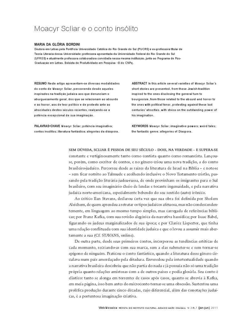 palavras-chave Moacyr Scliar; potncia imaginativa; contos inslitos; literatura fantstica; alegorias da dispora.