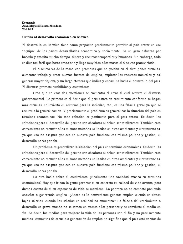 Crtica al desarrollo econmico en Mxico El desarrollo en Mxico tiene como propsito precisamente permitir al pas entrar en ese equipo de los pases desarrollados econmica y socialmente. Es un gran esfuerzo por hacerlo y amerita mucho tiempo, dinero y recursos temporales y humanos. in em!argo, todo se dice tan f"cil que hasta emociona y llega muy !ien a las masas el discurso pronunciado. El discurso #a de la mano con promesas que se quedan en el aire$ poner escuelas, aumentar tra!a%o y crear nue#as fuentes de empleo, explotar los recursos naturales y as generar mayor riqueza, y un largo etctera que indica y encamina hacia el desarrollo del pas. El discurso promete esta!ilidad y crecimiento. &reo que en esas dos cuestiones se encuentra el error al cual recurre el discurso gu!ernamental. 'a primera es el decir que el pas estar" en crecimiento conforme se hagan m"s escuelas, se in#ierta en recursos para la sociedad, etc., es una falacia gra#e ya que se recurre a la generalizacin. ( precisamente el pro!lema es generalizar la situacin del pas en trminos econmicos. )o toda solucin es pertinente para el pas entero. Es decir, las soluciones para el desarrollo del pas no son a!solutas ni de!en ser totalizantes. *am!in creo con#eniente no recurrir a los mismos mtodos utilizados en otros am!ientes y circunstancias, ya que eso no asegura que ac" en nuestro pas funcione esa misma poltica y gestin, el desarrollo no #a por ah. +n pro!lema es generalizar la situacin del pas en trminos econmicos. Es decir, las soluciones para el desarrollo del pas no son a!solutas ni de!en ser totalizantes. *am!in creo con#eniente no recurrir a los mismos mtodos utilizados en otros am!ientes y circunstancias, ya que eso no asegura que ac" en nuestro pas funcione esa misma poltica y gestin, el desarrollo no #a por ah. 'a otra ha!la so!re el crecimiento ,-ealmente una sociedad a#anza en trminos econmicos. /ay que ir con la gente para #er si en concreto su calidad de #ida a#anza, para darnos cuenta de si su esperanza de #ida se mantiene. 'a po!reza no se com!ate poniendo escuelas o generando empleo. ,0caso es lo con#eniente generar empleo cuando se tienen !a%os salarios, cuando los salarios en realidad no aumentan. 'a falacia del crecimiento o desarrollo es gra#e cuando no se toman en cuenta a las personas y se con#ierte el medio en fin. Es decir, los medios para me%orar la #ida de las personas son el fin y no precisamente medios. 0umentos de escuela o generacin de empleo no significa que el pas est en #as de