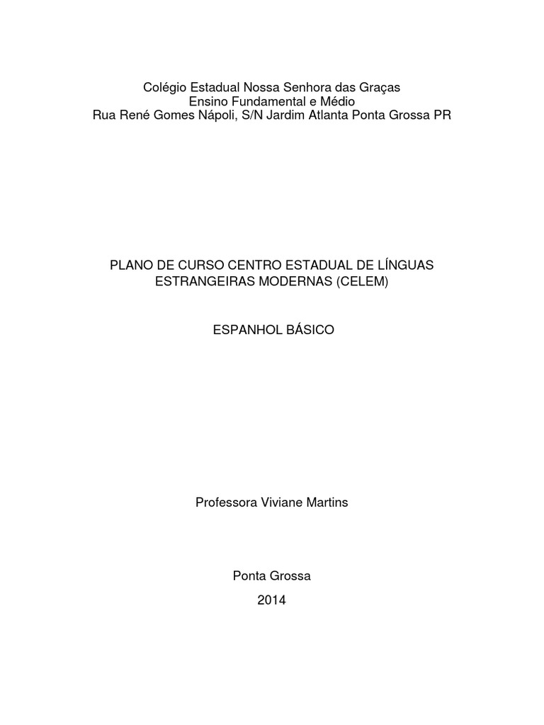 formal da gramtica deve estar subordinado ao conhecimento discursivo, ou seja, reflexes gramaticais devem ser decorrentes de necessidades especficas dos alunos, a fim de que se expressem ou construam sentidos com o texto. Ser usada tambm a abordagem comunicativa, onde a participao do aluno fundamental. O material didtico a ser seguido ser fornecido pela professora cuja referncia encontra-se ao final, sendo complementado por outros sempre que necessrio. Priorizar-se- o contato com as culturas do mundo hispnico, com as variedades culturais e lingusticas existentes, pois para uma melhor formao de um cidado consciente e responsvel este deve estar aberto s diversidades do mundo. As msicas sero utilizadas como complemento conforme andamento das aulas, podendo ser acrescentadas outras canes que contemplem os contedos estruturantes. A presente proposta tambm contempla a incluso das temticas Histria e Cultura Afro-Brasileira e Indgena (Lei no 11,645/08), Preveno ao uso Indevido s Drogas, Sexualidade Humana, Enfrentamento Violncia contra a Criana e o Adolescente, Direito da Criana e Adolescente (L.F. No 11525/07), Educao Ambiental (L.F. No 9795/99, Dec. No 4201/02) nos contedos a serem trabalhados, de acordo com o que for oportunizado pelo texto, dada a importncia que essas temticas trazem para a construo de um Estado Democrtico de Direito, de acordo com o que dispe a Constituio da Repblica Federativa do Brasil e a obrigatoriedade de seu ensino, segundo as Diretrizes Curriculares Nacionais, bem como a Deliberao Estadual 04/06.