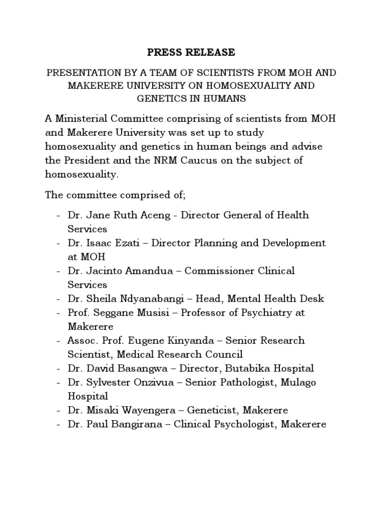 A Ministerial Committee comprising of scientists from MOH and Makerere University was set up to study homosexuality and genetics in human beings and advise the President and the NRM Caucus on the subject of homosexuality. The committee comprised of; - Dr. Jane Ruth Aceng - Director General of Health Services - Dr. Isaac Ezati Director Planning and Development at MOH - Dr. Jacinto Amandua Commissioner Clinical Services - Dr. Sheila Ndyanabangi Head, Mental Health Desk - Prof. Seggane Musisi Professor of Psychiatry at Makerere - Assoc. Prof. Eugene Kinyanda Senior Research Scientist, Medical Research Council - Dr. David Basangwa Director, Butabika Hospital - Dr. Sylvester Onzivua Senior Pathologist, Mulago Hospital - Dr. Misaki Wayengera Geneticist, Makerere - Dr. Paul Bangirana Clinical Psychologist, Makerere