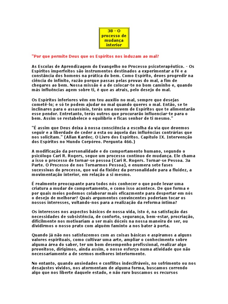 As Escolas de Aprendizagem do Evangelho no Processo psicoteraputico. - Os Espritos imperfeitos so instrumentos destinados a experimentar a f e a constncia dos homens na prtica do bem. Como Esprito, deves progredir na cincia do infinito, razo porque passas pelas provas do mal, a fim de chegares ao bem. Nossa misso a de colocar-te no bom caminho e, quando ms influncias agem sobre ti, que as atrais, pelo desejo do mal. Os Espritos inferiores vm em teu auxlio no mal, sempre que desejas comet-lo; e s te podem ajudar no mal quando queres o mal. Ento, se te inclinares para o assassnio, ters uma nuvem de Espritos que te alimentaro esse pendor. Entretanto, ters outros que procuraro influenciar-te para o bem. Assim se restabelece o equilbrio e ficas senhor de ti mesmo." " assim que Deus deixa nossa conscincia a escolha da via que devemos seguir e a liberdade de ceder a esta ou quela das influncias contrrias que nos solicitam." (Allan Kardec. O Livro dos Espritos. Captulo IX. Interveno dos Espritos no Mundo Corpreo. Pergunta 466.) A modificao da personalidade e do comportamento humano, segundo o psiclogo Cari R. Rogers, segue um processo contnuo de mudana. Ele chama a isso o processo de tornar-se pessoa (Cari R. Rogers. Tornar-se Pessoa. 3a Parte. O Processo de nos Tornarmos Pessoa), e enumera sete fases sucessivas do processo, que vai da fixidez da personalidade para a fluidez, a movimentao interior, em relao a si mesmo. realmente preocupante para todos ns conhecer o que pode levar uma criatura a mudar de comportamento, e como isso acontece. De que forma e por quais meios podemos colaborar mais eficazmente para despertar em ns o desejo de melhorar? Quais argumentos convincentes poderiam tocar os nossos interesses, voltando-nos para a realizao da reforma ntima? Os interesses nos aspectos bsicos de nossa vida, isto , na satisfao das necessidades de subsistncia, de conforto, segurana, bem-estar, procriao, dificilmente nos motivariam a ser mais dceis na nossa maneira de ser, ou dividirmos o nosso prato com algum faminto a nos bater porta. Quando j no nos satisfazemos com as coisas bsicas e aspiramos a alguns valores espirituais, como cultivar uma arte, ampliar o conhecimento sobre alguma rea do saber, ter um bom desempenho profissional, realizar algo proveitoso, dirigimos, ainda assim, o nosso esforo numa atividade que no necessariamente a de sermos melhores interiormente. No entanto, quando ansiedades e conflitos indecifrveis, no sofrimento ou nos desajustes vividos, nos atormentam de alguma forma, buscamos correndo algo que nos liberte daquele estado, e no raro buscamos os recursos