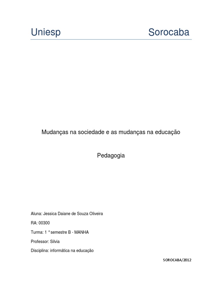 Aluna: Jessica Daiane de Souza Oliveira RA: 00300 Turma: 1 semestre B - MANHA Professor: Silvia Disciplina: informtica na educao SOROCABA/2012
