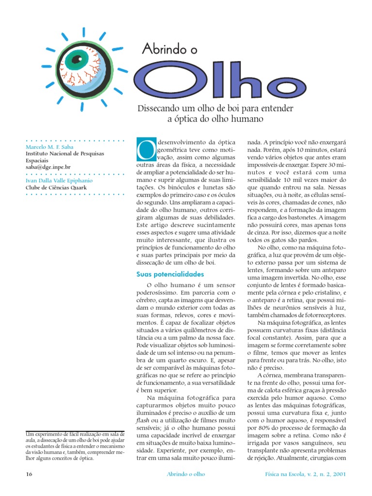 Um experimento de fcil realizao em sala de aula, a dissecao de um olho de boi pode ajudar os estudantes de fsica a entender o mecanismo da viso humana e, tambm, compreender melhor alguns conceitos de ptica.