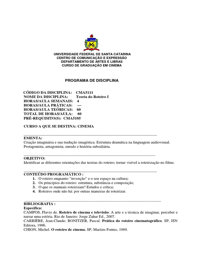 PROGRAMA DE DISCIPLINA CDIGO DA DISCIPLINA: CMA5111 NOME DA DISCIPLINA: Teoria do Roteiro I HORAS/AULA SEMANAIS: 4 HORAS/AULA PRTICAS: --HORAS/AULA TERICAS: 60 TOTAL DE HORAS/AULA: 60 PR-REQUISITO(S): CMA5105 CURSO A QUE SE DESTINA: CINEMA