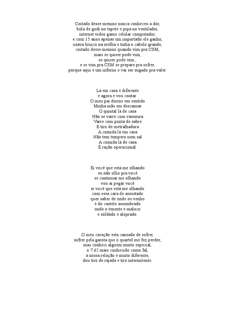 9em?nios camuflados v!o sair da escurid!o, sentinelas ensanguentados vai rolando pelo ch!o. me perguntam de onde eu venho> venho da escurid!o, trago morte, desespero e total destrui'!o. armadilhas camufladas, acionadores de tra'!o, quem vier atras de mim s. vai ouvir a e;plos!o> sangue frio em minhas veias congelou meu cora'!o, somos da CSM nosso lema e vibra'!o>