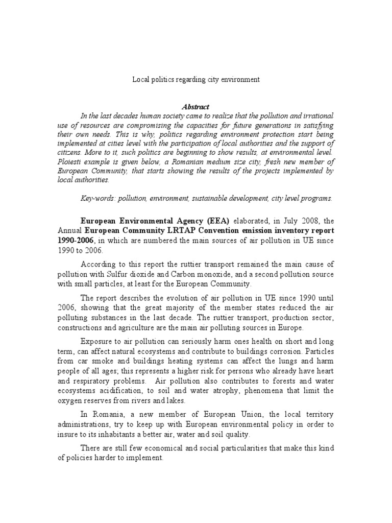 European Environmental Agency (EEA) elaborated, in July 2008, the Annual European Community LRTAP Convention emission inventory report 1990-200 , in which are numbered the main sources of air pollution in UE since !!0 to 200"# According to this report the ruttier transport remained the main cause of pollution with $ulfur dio%ide and &arbon mono%ide, and a second pollution source with small particles, at least for the European &ommunity# 'he report describes the evolution of air pollution in UE since !!0 until 200", showing that the great ma(ority of the member states reduced the air polluting substances in the last decade# 'he ruttier transport, production sector, constructions and agriculture are the main air polluting sources in Europe# E%posure to air pollution can seriously harm ones health on short and long term, can affect natural ecosystems and contribute to buildings corrosion# )articles from car smo*e and buildings heating systems can affect the lungs and harm people of all ages+ this represents a higher ris* for persons who already have heart and respiratory problems# Air pollution also contributes to forests and water ecosystems acidification, to soil and water atrophy, phenomena that limit the o%ygen reserves from rivers and la*es# ,n -omania, a new member of European Union, the local territory administrations, try to *eep up with European environmental policy in order to insure to its inhabitants a better air, water and soil .uality# 'here are still few economical and social particularities that ma*e this *ind of policies harder to implement#