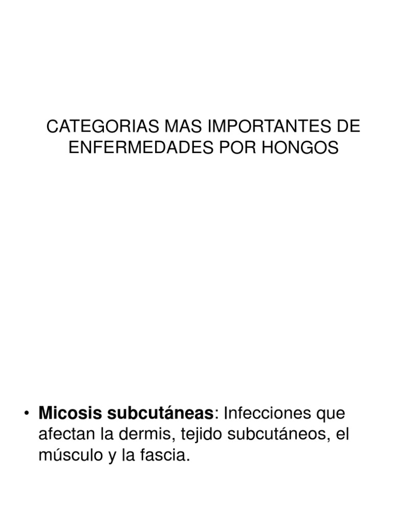 Micosis subcutneas: Infecciones que afectan la dermis, tejido subcutneos, el msculo y la fascia.