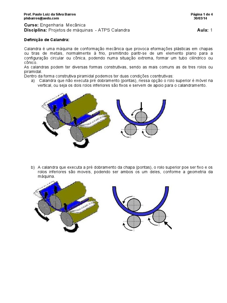 Calandra uma mquina de conforma !o mecnica que "ro#oca eforma $es "lsticas em cha"as ou tiras de metais% normalmente & frio% "remitindo "aritr-se de um elemento "lano "ara a configura !o circular ou c'nica% "odendo numa situa !o e(trema% formar um tu)o cil*ndrico ou c'nico+ As calandras "odem ter di#ersas formas construti#as% sendo as mais comuns as de tres rolos ou "iramidal+ ,entro da forma construti#a "iramidal "odemos ter duas condi $es cosntruti#asa. Calandra que n!o e(ecuta "r do)ramento /"ontas.% nessa o" !o o rolo su"erior m0#el na #ertical% ou seja os dois rolos inferiores s!o fi(os e ser#em de a"oio "ara o calandramento+