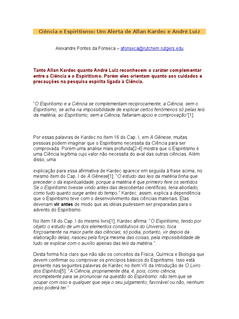 Tanto Allan Kardec quanto Andr Luiz reconhecem o carter complementar entre a Cincia e o Espiritismo. Porm eles orientam quanto aos cuidados e precaues na pesquisa esp rita li!ada " Cincia.