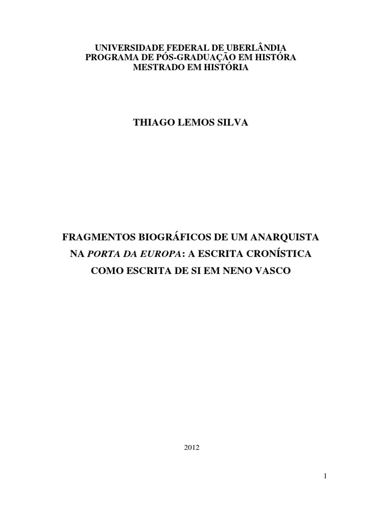Silva, Thiago Lemos, 1984Fragmentos biogrficos de um anarquista na Porta da Europa: a escrita cronstica como escrita de si em Neno Vasco. / Thiago Lemos Silva. Uberlndia, 2012. 138 f. Orientadora: Jacy Alves de Seixas. Dissertao (mestrado) Universidade Federal de Uberlndia, Programa de Ps-Graduao em Histria. Inclui bibliografia. 1. Histria - Teses. 2. Vasco, Neno - Biografia - Teses. 3. Vasco, Neno - Da porta da Europa - Crtica e interpretao - Teses. 4. Anarquismo e anarquistas - Europa - Histria - Teses. 5. Literatura e histria - Teses. I. Seixas, Jacy Alves de. II. Universidade Federal de Uberlndia. Programa de Ps-Graduao em Histria. III. Ttulo. CDU: 930