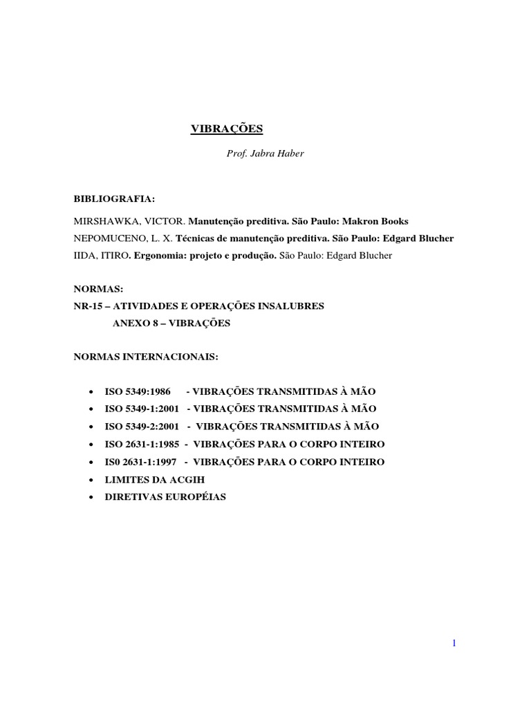 ISO 5349-1:2001 - VIBRAES TRANSMITIDAS MO ISO 5349-2:2001 - VIBRAES TRANSMITIDAS MO ISO 2631-1:1985 - VIBRAES PARA O CORPO INTEIRO IS0 2631-1:1997 - VIBRAES PARA O CORPO INTEIRO LIMITES DA ACGIH DIRETIVAS EUROPIAS