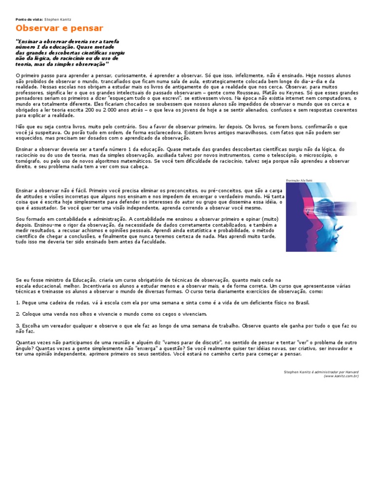 O primeiro passo para aprender a pensar, curiosamente, é aprender a observar. Só que isso, infelizmente, não é ensinado. Hoje nossos alunos são proibidos de observar o mundo, trancafiados que ficam numa sala de aula, estrategicamente colocada bem longe do dia-a-dia e da realidade. Nossas escolas nos obrigam a estudar mais os livros de antigamente do que a realidade que nos cerca. Observar, para muitos professores, significa ler o que os grandes intelectuais do passado observaram – gente como Rousseau, Platão ou Keynes. Só que esses grandes pensadores seriam os primeiros a dizer "esqueçam tudo o que escrevi", se estivessem vivos. Na época não existia internet nem computadores, o mundo era totalmente diferente. Eles ficariam chocados se soubessem que nossos alunos são impedidos de observar o mundo que os cerca e obrigados a ler teoria escrita 200 ou 2.000 anos atrás – o que leva os jovens de hoje a se sentir alienados, confusos e sem respostas coerentes para explicar a realidade.