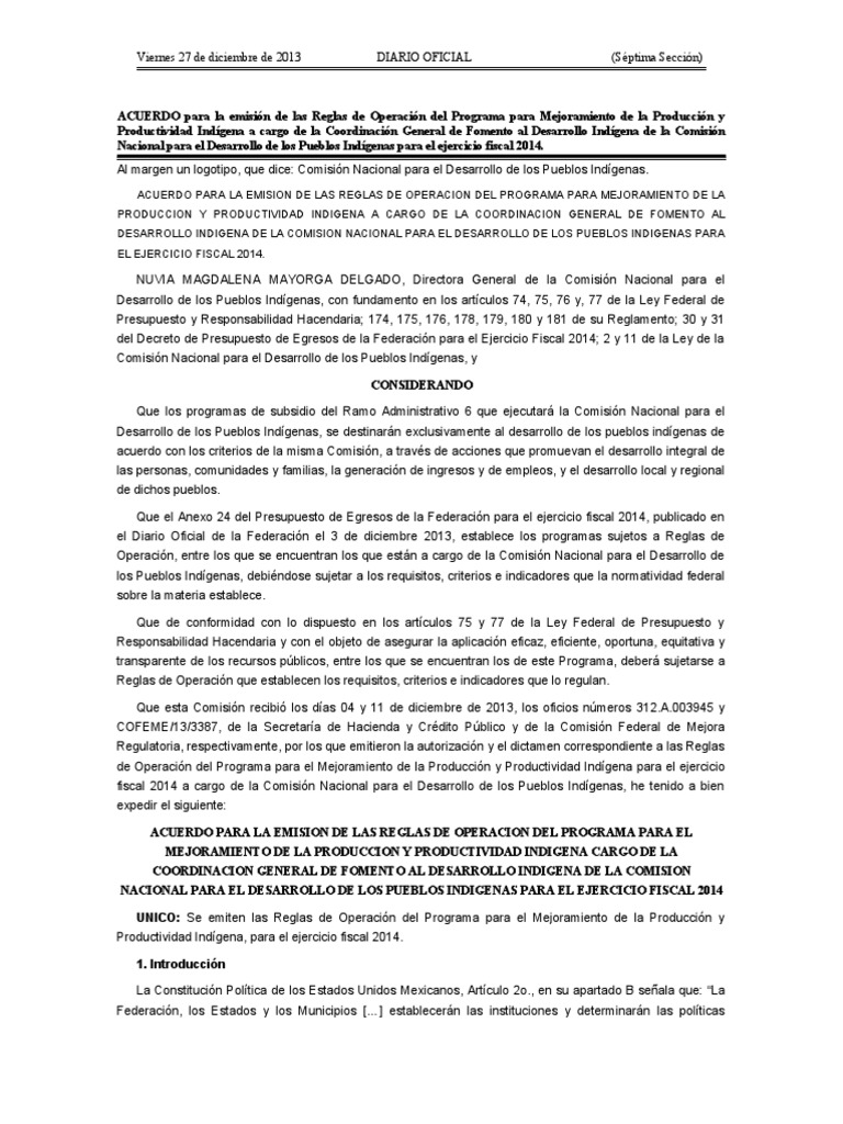 de Operacin del Programa para el Mejoramiento de la Produccin y Productividad ndgena para el ejercicio