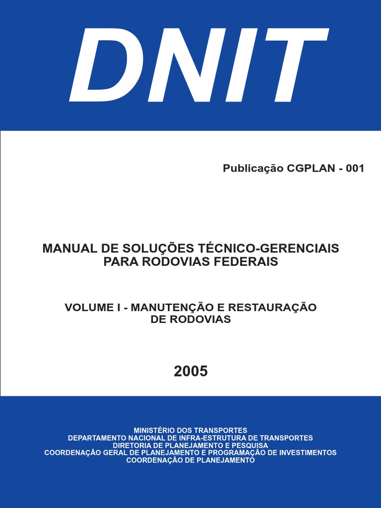 Brasil. Departamento Nacional de Infra-Estrutura de Transportes. Diretoria de Planejamento e Pesquisa. Coordenação Geral de Planejamento e Programação de Investimentos. Coordenação de Planejamento. Manual de soluções técnico-gerenciais para rodovias federais. - Brasília, 2005. 3v. (DNIT. CGPLAN. Publ., 001).
