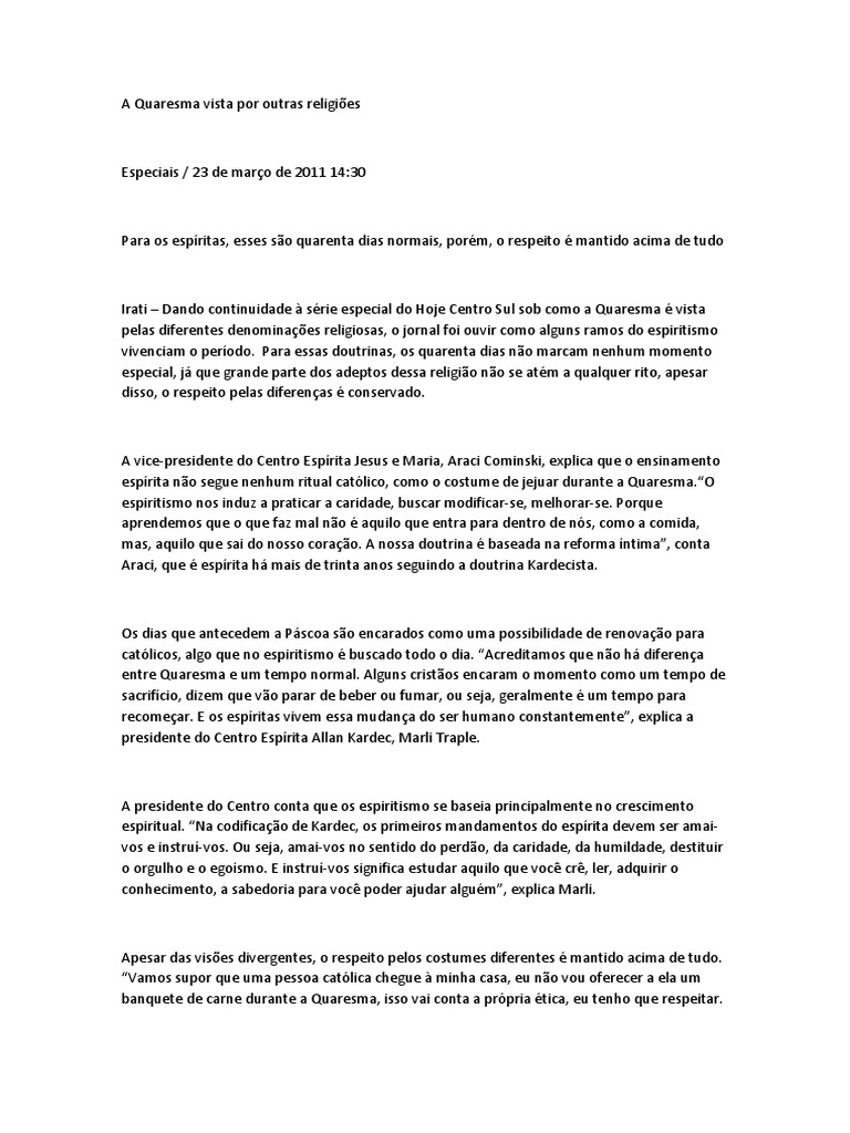 esprita no segue nenhum ritual catlico, como o costume de jejuar durante a Quaresma.O