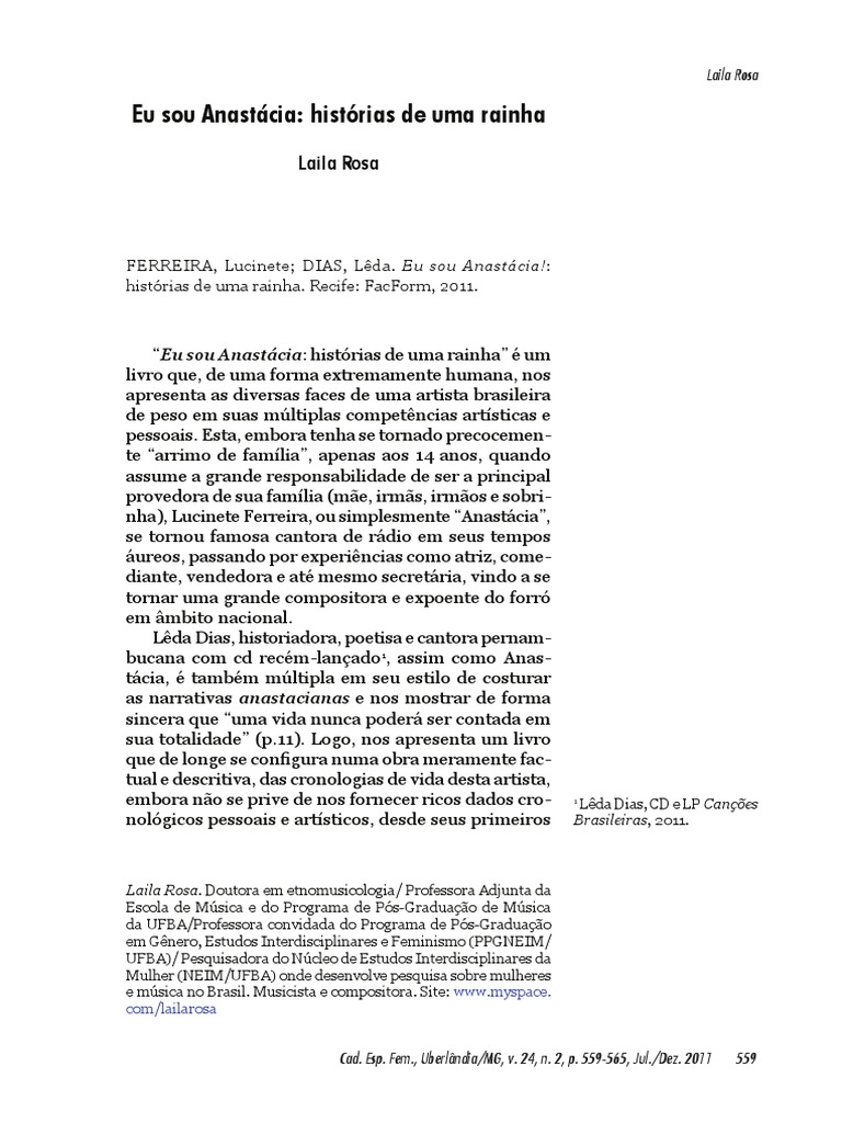 FERREIRA, Lucinete; DIAS, Lda. Eu sou Anastcia!: histrias de uma rainha. Recife: FacForm, 2011.