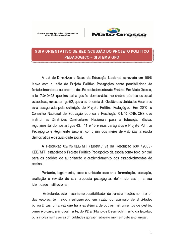 CEE/MT) estabelece o Projeto Poltico Pedaggico da escola como foco central