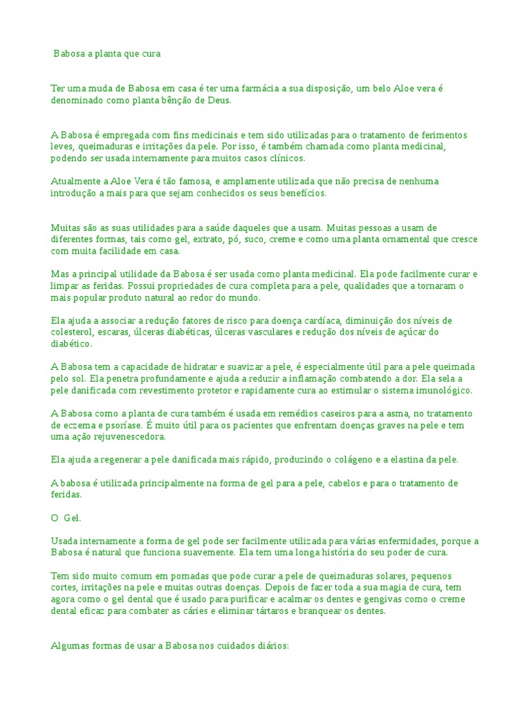 A Babosa é empregada com fins medicinais e tem sido utilizadas para o tratamento de ferimentos