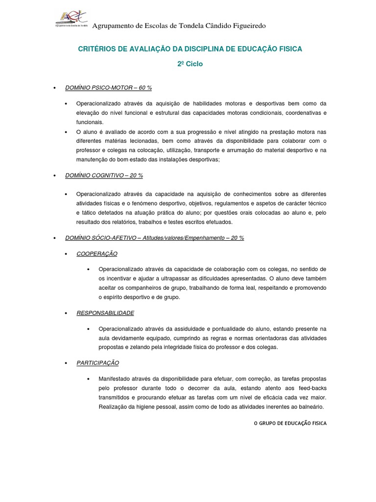 Operacionalizado atravs da aquisio de habilidades motoras e desportivas bem como da elevao do nvel funcional e estrutural das capacidades motoras condicionais, coordenativas e funcionais. O aluno avaliado de acordo com a sua progresso e nvel atingido na prestao motora nas diferentes matrias lecionadas, bem como atravs da disponibilidade para colaborar com o professor e colegas na colocao, utilizao, transporte e arrumao do material desportivo e na manuteno do bom estado das instalaes desportivas;