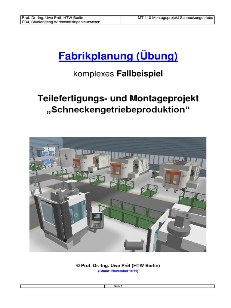 Fr die Herstellung von Schneckengetrieben (als Ergebnis einer Segmentierung) ist die Planung eines Fertigungsbereiches fr die mechanische Fertigung und Montage durchzufhren. Die fr die Herstellung notwendigen Konstruktionsdaten (Zeichnungen, Stcklisten) und Fertigungsunterlagen (Arbeitsplne, Betriebsmittelcharakteristiken) sind gegeben und bedrfen einer kritischen Bewertung und abschlieenden Entscheidung. Der