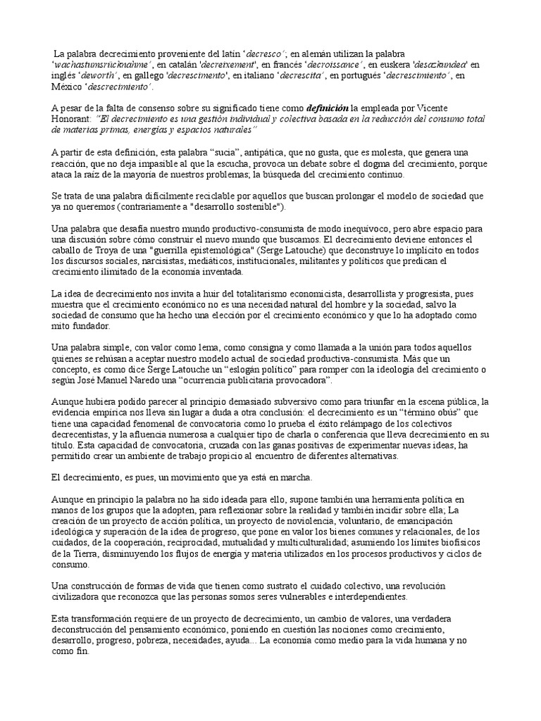 La palabra decrecimiento proveniente del latn decresco; en alemn utilizan la palabra