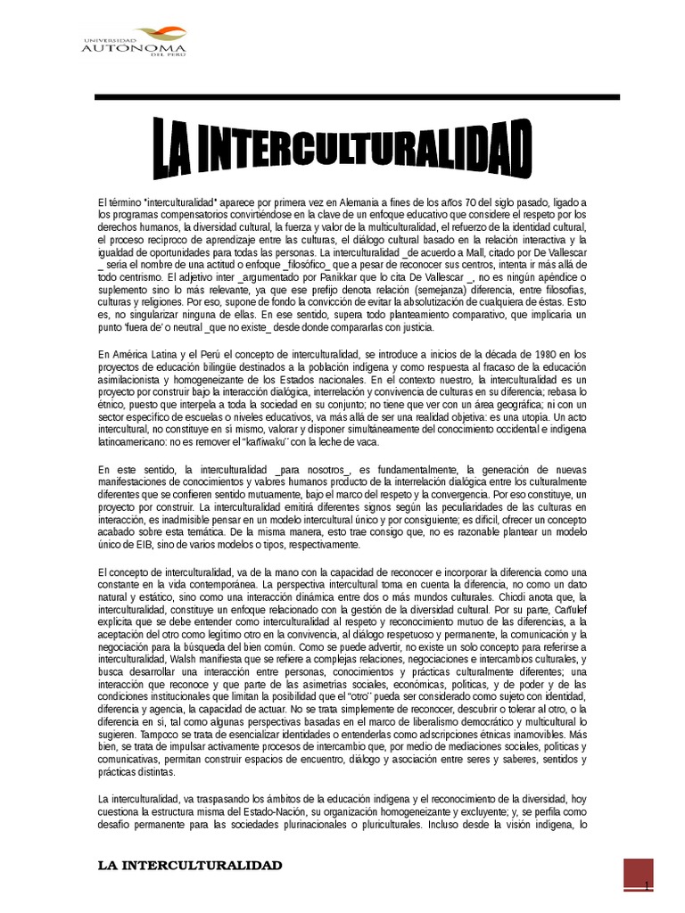 igualdad de oportunidades para todas las personas. La interculturalidad _de acuerdo a Mall, citado por De Vallescar