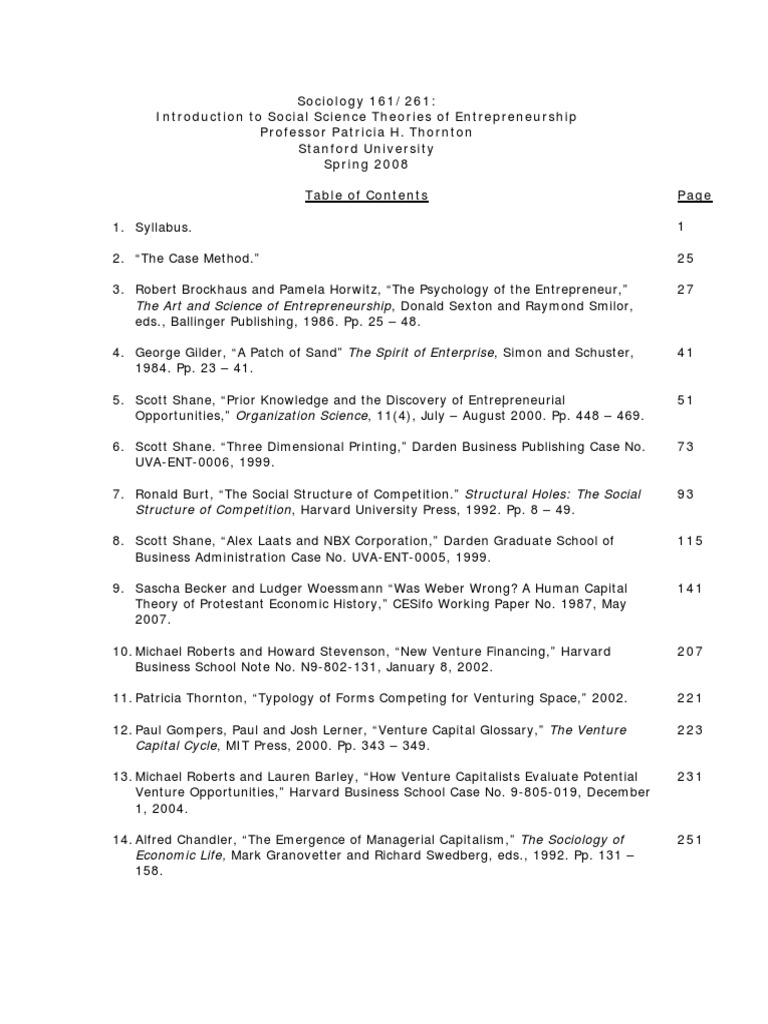 Course Description Who is likely to become an entrepreneur? How do you discover entrepreneurial opportunities? What are the factors that affect the success of entrepreneurial ventures? We will examine these questions in light of classic and contemporary theory and empirical research in the social sciences.