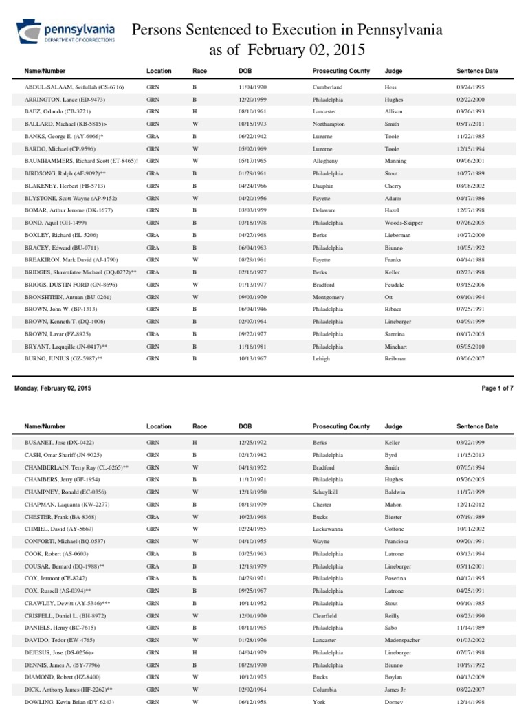 Persons Sentenced to Execution in Pennsylvania