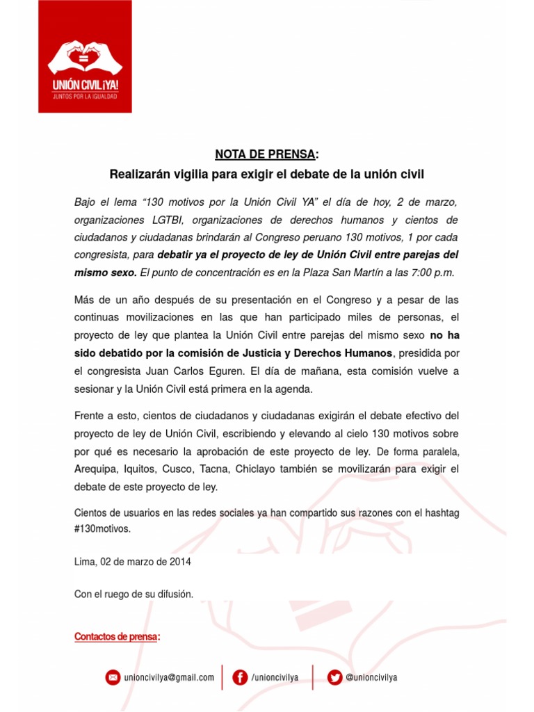 Bajo el lema 130 motivos por la Unin Civil YA el da de hoy, 2 de marzo,